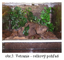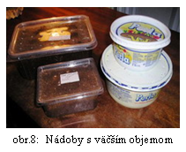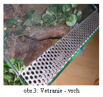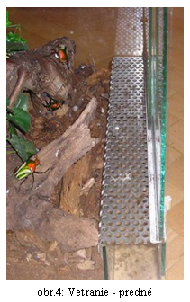 INSEKTÁRIUM: 1.Typ: Na chov imág sa môže použiť sklenená nádrž s prístupom z vrchu, alebo s posúvnymi dvierkami vpredu, resp. na bočnej strane (obr.1,2). Nádrže musia spĺňať určité kritériá, ako je veľkosť, odvetranie (obr.3,4,5), ľahký prístup k vnútornému vybaveniu a možnosť vytvoriť min. 10 cm vrstvu substrátu. 2.Veľkosť: Veľkosť zvolíme podľa počtu a veľkosti imág ktoré chováme. Malým druhom (Pachnoda, Smaragdesthes, Cetonischema) stačí 30x20x30 cm pre skupinu 10ks (4+6),stredne veľkým (Coelorrhina, Dicronorhina, Eudicella) druhom 30x30x30cm pre skupinu 2+4 a veľkým druhom (Chalcosoma, Goliathus) 50x50x60 cm pre skupinu 11-13. Insektárium volíme radšej väčšie ako menšie. Nároky na priestor rastú úmerne počtu a veľkosti chovaného druhu. Niektoré druhy (Dynastinae) prenášajú substrát a preto by sa mal dať substrát navýšiť do min. výšky 15-20 cm. Iné druhy (Smaragdesthes) radi lietajú, a preto by malo byť insektárium dostatočne vysoké. Veľkým insektáriom sa nedá nič pokaziť. 3.Umiestnenie: Insektárium nikdy neumiestňujeme na priame slnko, do prievanu, k výhrevným telesám. Na priamom slnku dochádza k akumulácii tepla vo vnútri insektária, prehriatiu a úhynu jeho obyvateľov. V prievane sa ťažšie udržuje mikroklíma insektária a výhrevné telesá rýchlejšie vysúšajú substrát. 4.Osvetlenie: Väčšine chovaných druhov s dennou aktivitou je potrebné prisvetľovať. Dĺžka svietenia by mala byť 10-12 hod. V insektáriu môžeme svietiť žiarovkou aj žiarivkou. Druhom so súmračnou a nočnou aktivitou netreba svietiť vôbec. Väčšina svetelných zdrojov vytvára okrem svetla aj teplo a preto by k nemu nemali mať obyvatelia insektária prístup (obr.6). 5.Teplota: Na vyhrievanie insektária väčšinou stačí svetelný zdroj. Teplota cez deň by mala byť 22-30°C, v noci môže mierne poklesnúť. Každý druh prosperuje (vyššia produkcia vajíčok, dlhší život)pri určitom rozmedzí teplôt. Smaragdesthes 27-30°C, Eudicella 25-27°C. Tropické chrobáky znesú skôr pokles, ako krátkodobé prehriatie. (Pri vyššej teplote sa urychľuje vývojový cyklus ale kráti sa život imága, pri nižšej teplote sa vývoj predĺži ale imágo je životaschopnejšie). 6.Vlhkosť: Pre imága je dôležitá ako vlhkosť vzduchu, tak vlhkosť substrátu. Terárium 2-3× týždenne rosíme vodou, pretože imága potrebujú piť a môžu uhynúť na dehydratáciu. Vlhkosť substrátu je dôležitá hlavne pri kladení vajíčok, samička vyhľadáva miesta s optimálnou vlhkosťou. Insektárium nieje vhodné dávať blízko k radiátoru lebo substrát rýchlo vysychá. Substrát nesmie NIKDY vyschnúť!!! NÁDOBY NA LARVY 1.Typ a veľkosť Larvy môžeme chovať buď priamo v insektáriu alebo v samotnej nádobe. Larvy so sklonmi ku kanibalizmu chováme až do L3 samostatne v cca 110ml nádobách používaných na šaláty (obr.7), ako larvy rastú premiestnime ich do väčších nádob (cca 500ml kelímok od masla)(obr.8). Od štádia L3 môžeme tieto larvy chovať spolu vo veľkej nádobe -10 l vedro (obr.9). Do vedra môžeme umiestniť len určitý počet lariev, v závislosti od ich veľkosti (Chelorrhina 10-15 L3/10l, Eudicella gralli 30-40). Larvy, ktoré sa navzájom znášajú môžeme dať od L1 do spoločnej veľkej nádoby. K určitým stratám vždy dôjde, ale pri vyššom počte sú zanedbateľné. (Zo 100 ks L1 Eud. Smithi bert. bolo cca 75 kokonov v 10 l. vedre. Nádoby musia mať otvory na odvetranie a musia byť zabezpečené proti úniku lariev, lebo niektoré larvy majú dostatočnú silu na to, aby vytlačili vrchnák na kelímku od masla. 2. Umiestnenie Nádoby s larvami nedávame k teplému zdroju, lebo substrát rýchlo vyschne a larvy uhynú. K nádobam s larvami musíme mať ľahký prístup, aby sa dali pravidelne kontrolovať (obr.10). 3. Osvetlenie Larvy sú svetloplaché, takže im netreba prisvetľovať. 4. Teplota Teplota hrá vo vývoji dôležitú úlohu. Vo väčšom objeme sa ľahšie udržuje štandardná teplota a sú v ňom aj menšie teplotné výkyvy. Menší objem substrátu skôr vysychá. Ak je teplota substrátu príliš vysoká, larvy vyliezajú na povrch. Ak chováme larvy v insektáriu, pod ktorým je umiestnený svetelný – tepelný zdroj ďalšieho insektária, musíme dávať pozor na vysychanie spodnej vrstvy substrátu, v ktorom sú väčšinou vajíčka aj larvy. 5. Vlhkosť Substrát nesmie nikdy vyschnúť. Ideálna vlhkosť je keď zoberieme substrát do ruky a cítime jeho vlhkosť, ale nelepí sa v hrudky. Pri suchom substráte vysychajú vajíčka a larvy majú problém sa zvliecť - hynú! Pri prevlhčenom substráte sa množia roztoče, plesne a huby – úhyn lariev aj imág. Vlhkosť substrát treba pravidelne kontrolovať. SUBSTRÁT Substrát slúži ako potrava pre larvy, úkryt pre imága a miesto, kam kladú vajíčka. Niektoré rody majú špecifické nároky na zloženie substrátu. Základné komponenty na prípravu substrátu sú: Listovka: Za viac menej univerzálny substrát je chovateľmi považovaná buková listovka – čiastočne prehnité listy buku. Vhodná je tiež listovka dubová. Dajú sa však veľmi dobre použiť aj listy iných druhov stromov, ktoré sú vhodné predovšetkým do zmesí Kompost: Pre naše potreby vyhovuje čiastočne prehnitý rastlinný materiál, najlepšie rôzne druhy tráv a iných rastlín. Kompost nesmie obsahovať kuchynské zbytky, okrem surovej listovej zeleniny a ovocia. Drnovka: Sú to čiastočne prehnité koreňové baly rastlín z väčšej časti zbavené zeminy. Práchnivé drevo: Potrebná zložka substrátu, hlavne pre nosorožteky a pre niektoré druhy zlatoňov. Používame drevo listnatých stromov, najlepšie dubu, buku, lipy, topoľov a iných. Kusy prehnitého dreva môžeme odobrať zo starých zoťatých alebo spadnutých stromov. Rozdiel v kvali